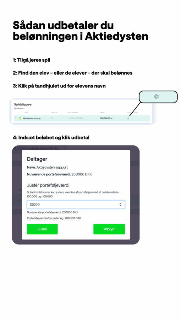 I Aktiedysten kan du nemlig udbetale ekstra fiktive penge til dem, der har gjort sig umage, afleveret til tiden eller løst en opgave særligt godt. Og ja – pengene lander direkte i deres portefølje.